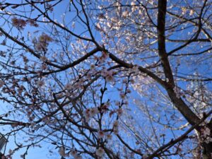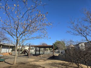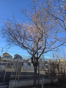 お写真は、冬の園庭です。園庭の冬桜が、満開です。ねむの木はさやが垂れ下がり、風が吹くとさやの中の種がカラカラなります。園庭で青い葉をつけているのは、ミモザの木だけになってしまいました。