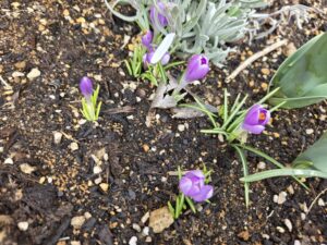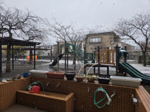 今日の園庭の様子です。雪がやんでからの、花壇です。年中のみんなで植えた球根が、次々と咲き始めました。確実に春が近づいています。