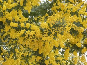黄色いお花は、ミモザです。園庭に、今年はたくさん咲きました。マルシェにお越しのさいは、ぜひミモザもご覧になってください。