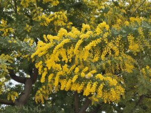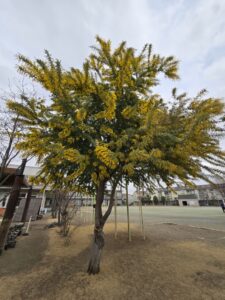 黄色いお花は、ミモザです。園庭に、今年はたくさん咲きました。マルシェにお越しのさいは、ぜひミモザもご覧になってください。