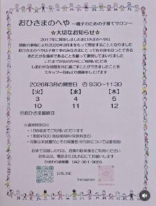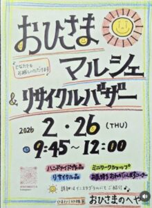 3月末で閉室となるおひさまのへやで、おひさまマルシェが2月26日木曜日にございます。下のお写真はおひさまのへやInstagramからのご案内です。最後の、おひさまマルシェです。みなさまお誘いの合わせの上、どうぞお越しくださいませ。